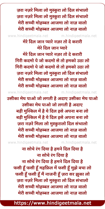 Lyrics of Zara Nazare Mila Lo Muskura Lo Dil Sambhalo - ज़रा नज़रे मिला लो मुस्कुरा लो दिल संभालो