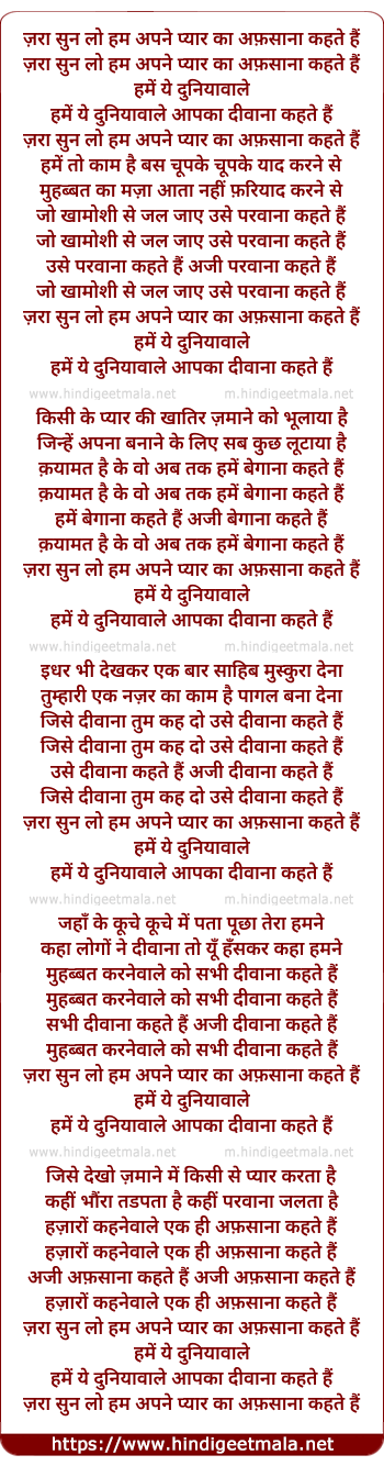 Lyrics of Zaraa Sun Lo Ham Apane Pyaar Kaa Afasaanaa Kahate Hain - ज़रा सुन लो हम अपने प्यार का अफ़साना कहते हैं