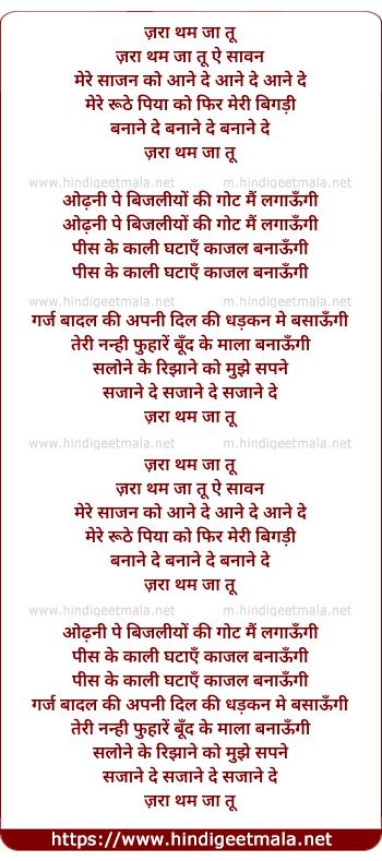 Lyrics of Zaraa Tham Jaa Tu Ae Saavan Mere Saajan Ko Aane De - ज़रा थम जा तू ऐ सावन मेरे साजन को आने दे