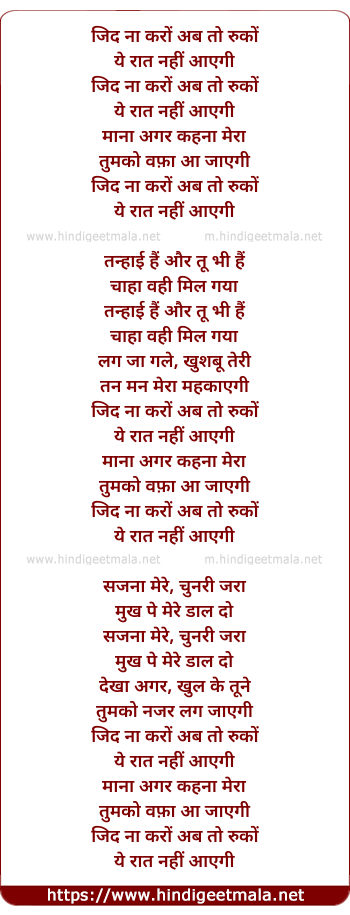 Lyrics of Zid Na Karo Ab To Ruko (Female) - जिद ना करों अब तो रुकों