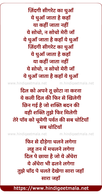 Lyrics of Zindagii Cigarette Ka Dhuaan - ज़िंदगी सीगरेट का धुआँ