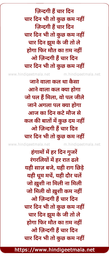 Lyrics of Zindagi Hai Chaar Din - ज़िन्दगी हैं चार दिन