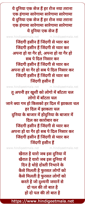 Lyrics of Zindagi Haseen Hai, Zindagi Se Pyar Kar - जिंदगी हसीन है, जिंदगी से प्यार कर