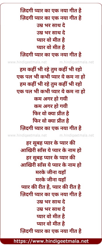 Poetic Translation - Lyrics of Zindagi Pyar Ka Ek Naya Geet Hai (Female) - ज़िदगी प्यार का एक नया गीत है